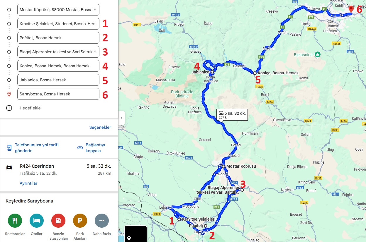 Günün her anından faydalanarak yapacağınız bir yolculukta sabah 07.00 civarında Mostar’dan çıkarsanız, uğrayacağınız yerlerde çok aceleniz olmadan zaman geçirebilir ve akşam 17.00 gibi Saraybosna’ya varabilirsiniz. Ancak tabi ki keyfinizin kahyasının fikri doğrultusunda aşağıdaki duraklardan istediğinizi rotanızdan çıkarabilirsiniz. Bizim izlediğimiz rota;