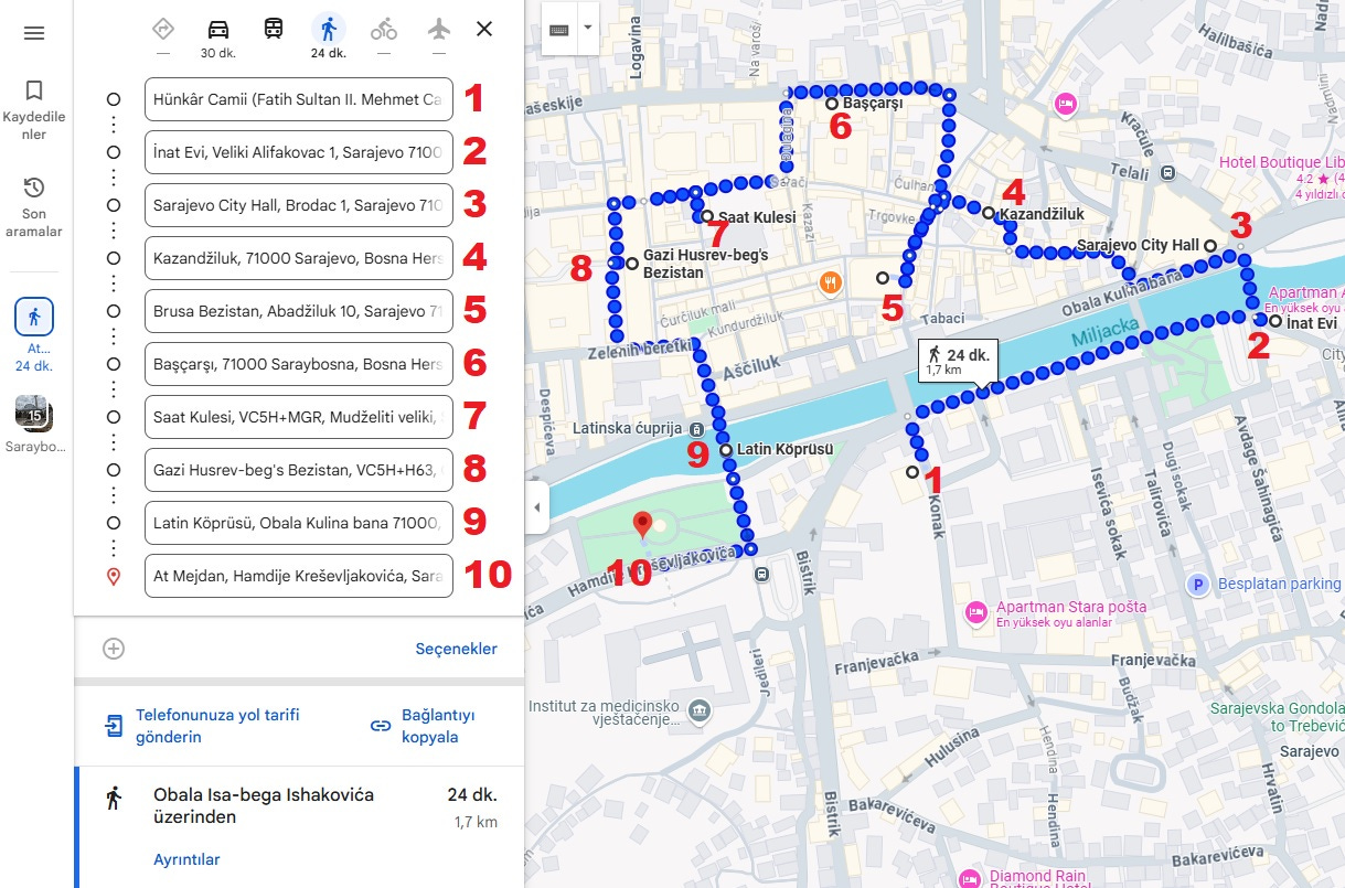 Varış sonrası 2 gece konaklama Saraybosna’da olacağı için, Saraybona’daki uğrak noktalarını bu akşam, yarın akşam ve son gün sabaha yaymanızı öneririm. Keza yaptığımız plana göre yarın gündüz Srebrenitsa rotası takip edilecek. Saraybosna’daki ilk akşamınızda aşağıdaki yarım saatlik yürüyüş rotasınının tamamını, ya da yorgunluk durumuna göre belirli bir kısmını takip edebilirsiniz.