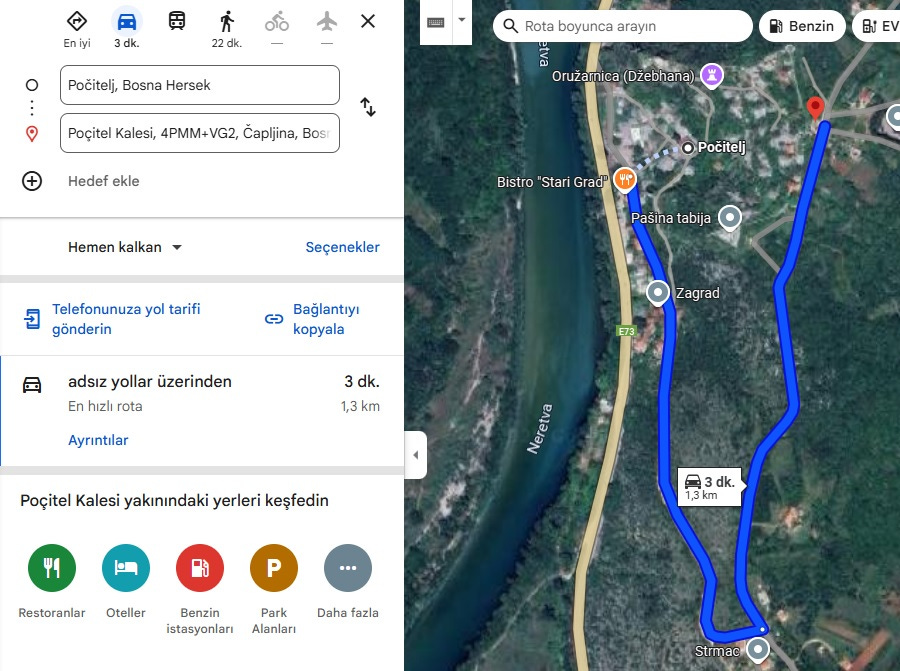 Pocitel’in nehire bakan, ve aracınızı önünde bırakacağınız “Bistro Stari Grad” restoranının önündeki yolu, “Burası trafiğe açık değildir herhalde?” diye düşünceler içinde güney yönlü yokuş yukarı takip etmeye başlayın. Yokuş tamamlandığında yol da sola dönmeye başlayacak. İlk kavşaktan sola dönüp biraz daha ilerleyince, Pocitelj Kalesi’nin girişi solunuzda kalacak, böylelikle 3-5 dk’da tamamladığınız bu rota sizi kalenin girişine getirmiş olacak. Siz kalenin kapısından şehre girip, dar sokaklardan yokuş aşağı yönlü şehri gezerken, kurban seçtiğiniz şoför ise aynı yolu takip ederek, “Bistro Stari Grad”‘ın önüne aracını park edip, sizi beklerken bir kahve içecek zaman bulacaktır. Map uygulamasında bu yolun tarifinde bazen sorunlar olabiliyor bu sebeple izleyeceğiniz yolun harita görüntüsünü de aşağıya bırakıyorum;
