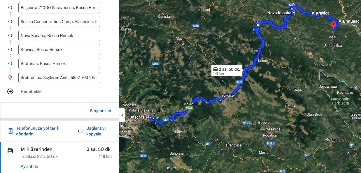 Karanlık turizme oldukça mesafeli duran bizler, ilk Bosna ziyaretimizde gitmesek de, daha sonra Srebrenitsa’nın görülmeden Bosna’nın tam anlamıyla anlamlandırılamayacağını farkederek aşağıdaki rota üzerinden anıtın yolunu tuttuk.