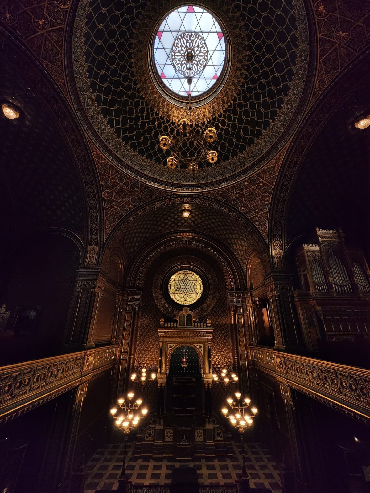 Cumartesi günü kapalı olan sinagog diğer günler 10.00-16.30 arasında ziyaretçilerini ağırlıyor. 1868 yılında inşa edilen singagogda, Çek milli marşının bestecisi František Škroup, 1836-45 yılları arasında orgcu olarak görev yapmış. El Hamra Sarayı’nın mağribi tarzından etkilenerek oluşturulan iç tasarımının uyandırdığı merak duygusuyla bilet aldığımız sinagogun bizde hayal kırıklığı yarattığını söylemeliyiz. Bölgedeki yahudi tarihine özel bir ilginiz yoksa, siz de benzer bir hayal kırıklığı ile karşılaşabilirsiniz.