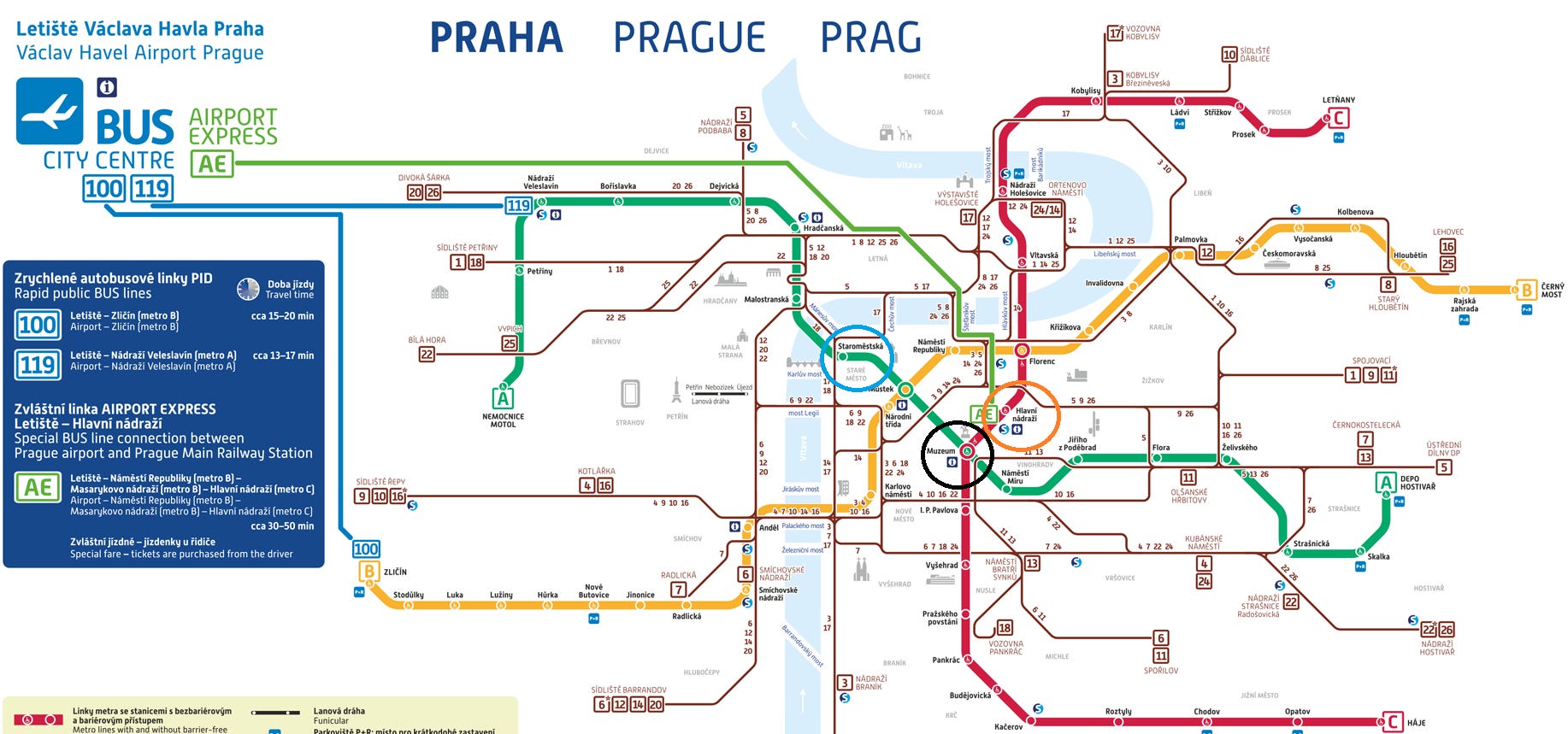 Hlavna Nadrazi’den (turuncu daire) C metrosuna binerek Muzeum durağına(siyah daire), Muzeum’da A hattına geçerek, Staromestská’da(mavi daire) inmeniz gerekmekte. Biletleri tren istasyonundaki otomatları kullanarak alabilirsiniz. Yetişkin biletleri, 30 dakikalık olanlar 30 CZK ve 90 dakikalık olanlar 40 CZK. 15 yaş altı ücretsiz, ayrıca pek alışık olmadığımız şekilde her bir bavul için de 20 CZK karşılığında bilet almanız gerekmekte.
